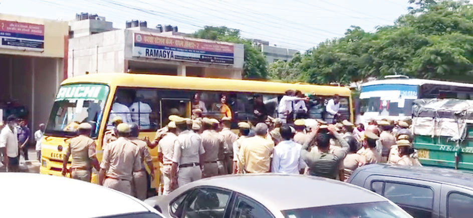 नोएडा। नोएडा प्राधिकरण की नीतियों के खिलाफ 81 गांव के किसानों के प्रदर्शन के दूसरे दिन भी लगभग ढाई सौ किसानों ने सेक्टर 6 प्राधिकरण गेट पर पहुंचकर नारेबाजी शुरू की। तभी पुलिस ने उन्हें हिरासत में लेकर बसों में भरकर पुलिस लाइन भेज दिया। जबकि पूर्व में गिरफ्तार किसान नेता एवं किसान अभी तक दिया नहीं किए गए हैं। गौरतलब है कि धारा 144 के चलते किसानों की गिरफ्तारी लगातार जारी है। किसान भारतीय किसान परिषद के नेतृत्व में आज दूसरे दिन भी अपनी मांग आबादी, मुआवजा आदि समस्याओं को लेकर धरना देने पहुंचे। आज भी कई थाना क्षेत्रों में जगह-जगह नाकेबंदी कर पुलिस तैनात की गई थी।