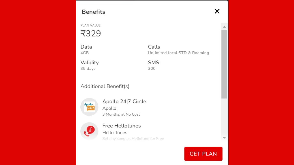 इस रिचार्ज प्लान पर ग्राहकों को पहले की तरह ही 4GB डेटा ऑफर किया जा रहा है। इसके अलावा, प्लान में अनलिमिटेड लोकल एसटीडी रोमिंग कॉलिंग की सुविधा मिल रही है। रिचार्ज प्लान में 300 SMS और Apollo 24/7 Circle, Free Hellotunes और Wynk Music की सर्विस मिलती रहेगी।