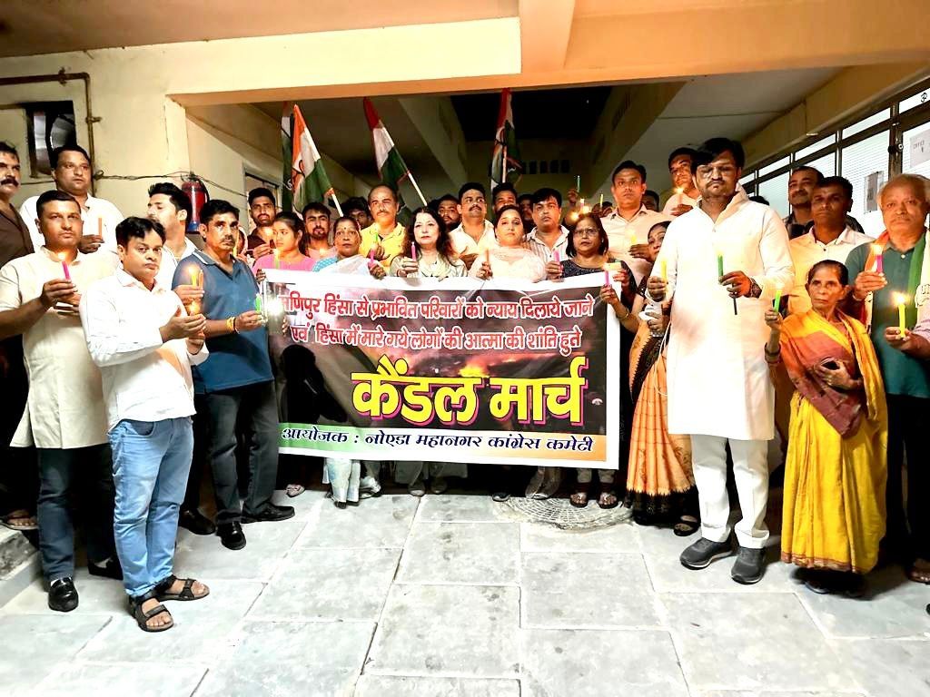 Candle March For Manipur आपको बता दें कि सामाजिक कार्यकर्ता व नोएडा महानगर कांग्रेस कमेटी के अध्यक्ष रामकुमार तंवर के नेतृत्व में मणिपुर की निंदनीय घटनाओ को लेकर एक दिवसीय उपवास व कंडेल मार्च निकाला गया। इस मौके पर महानगर अध्यक्ष रामकुमार तंवर ने कहा कि मणिपुर में खुंखार दरिंदों का झुंड आदिवासी लड़कियों को सरेआम नंगा घुमा रहा हैं. मणिपुर की इस दर्दनाक घटना ने लोगो के दिलो को झकझोर कर रख दिया है। हम राष्ट्रपति जी से माँग करते है कि मणिपुर मे राष्ट्रपति शासन लागू करके वहाँ के हालात सामान्य किये जाए और शांति व्यवस्था बनाई जाए । उन्होंने कहा कि प्रधानमंत्री नरेंद्र मोदी को केवल भाषण और रेडियो पर मन की बात और फैशन करने से तनिक भी फुर्सत नहीं । पिछले दस सालों में भीड़ तंत्र का उत्साहवर्धन हुआ है, अपराधी भीड़ को फूल मालाएँ पहनाई जा रही है । इस कारण अपराधियों के झुण्ड मणिपुर जैसे घिनौने अपराध को अन्जाम देते हैं ।