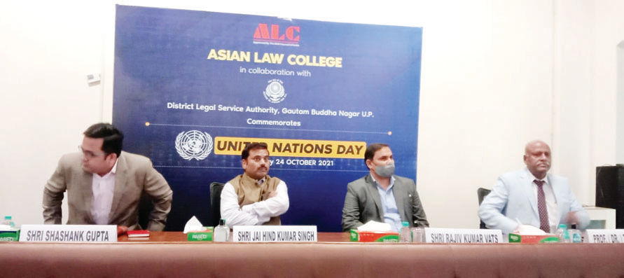 उक्त साक्षरता शिविर के माध्यम से संयुक्त राष्ट्र संघ के गठन तथा उक्त दिवस के महत्व पर कार्यक्रम की अध्यक्षता कर रहे राजीव कुमार वत्स अपर जिला जज ,के साथ जय हिंद कुमार सिंह सचिव जिला विधिक सेवा प्राधिकरण, शशांक गुप्ता सिविल जज एवं एशियन लॉ कॉलेज के प्रोफेसर, डायरेक्टर टी एन प्रसाद द्वारा उपस्थित विधि के छात्र वह कॉलेज स्टाफ आदि के मध्य विचार व्यक्त किए गए।